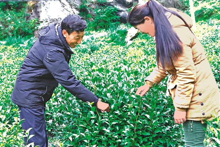 圖為勒門巴民族鄉(xiāng)茶葉農(nóng)牧民專業(yè)合作社理事長羅布次仁(左)和技術(shù)指導(dǎo)達娃卓瑪在查看茶葉長勢