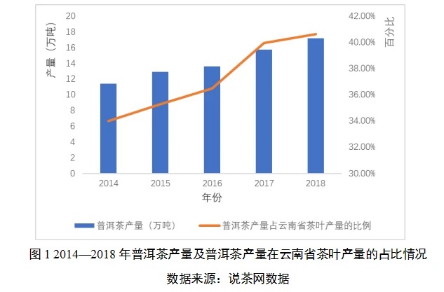 (一)產(chǎn)量持續(xù)增加。近五年來,普洱茶產(chǎn)量呈持續(xù)增加的趨勢(shì),從2014年的11.4萬噸增長(zhǎng)到2018年的17.2萬噸;普洱茶占比也不斷提高,從2014年的34.0%提高到2018年的40.6%。