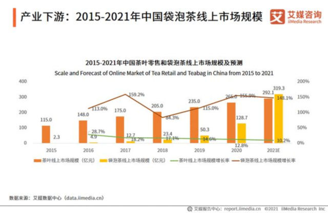 產(chǎn)業(yè)下游:2015-2021年中國(guó)袋泡茶線(xiàn)上市場(chǎng)規(guī)模