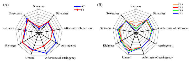 兒茶素,尤其是表沒食子兒茶素沒食子酸酯(EGCG)和表兒茶素沒食子酸酯(ECG)是茶葉苦澀味的最主要來源。秋茶經(jīng)冠突散囊菌PW-1發(fā)酵后,兒茶素總量從118.35 mg/g下降到10.58 mg/g,下降幅度達 91.06%;且發(fā)酵秋茶中酯化兒茶素EGCG和ECG的含量分別為0.37 mg/g和0.40 mg/g,表明菌株P(guān)W-1發(fā)酵可顯著降低秋茶中的兒茶素含量。通過電子舌技術(shù)對秋茶和冠突散囊菌PW-1發(fā)酵秋茶的滋味特征進行分析,發(fā)現(xiàn)秋茶的澀味顯著降低而鮮味強度有所增加,表明秋茶經(jīng)菌株P(guān)W-1發(fā)酵后的滋味品質(zhì)得到顯著提高。此外,通過電子舌技術(shù)首次對茶褐素的滋味特征進行分析,發(fā)現(xiàn)茶褐素無澀味而呈強烈的鮮味,為發(fā)酵秋茶中的主要呈味物質(zhì)。