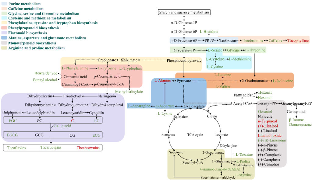 GC-MS分析結(jié)果顯示,秋茶中醇類揮發(fā)性成分的含量在冠突散囊菌PW-1發(fā)酵后顯著增加,其中呈花果香味的(Z)-芳樟醇氧化物、芳樟醇、(E)-芳樟醇氧化物(呋喃型)和 1-辛烯-3-醇的含量最高,表明菌株P(guān)W-1顯著提升了秋茶的香氣品質(zhì)。代謝途徑分析結(jié)果顯示,冠突散囊菌PW-1提升秋茶品質(zhì)主要與丙氨酸、天冬氨酸和谷氨酸代謝途徑,甘氨酸、絲氨酸和蘇氨酸代謝途徑,氨酰-tRNA 生物合成途徑,精氨酸生物合成途徑以及精氨酸和脯氨酸代謝途徑的表達相關(guān)。